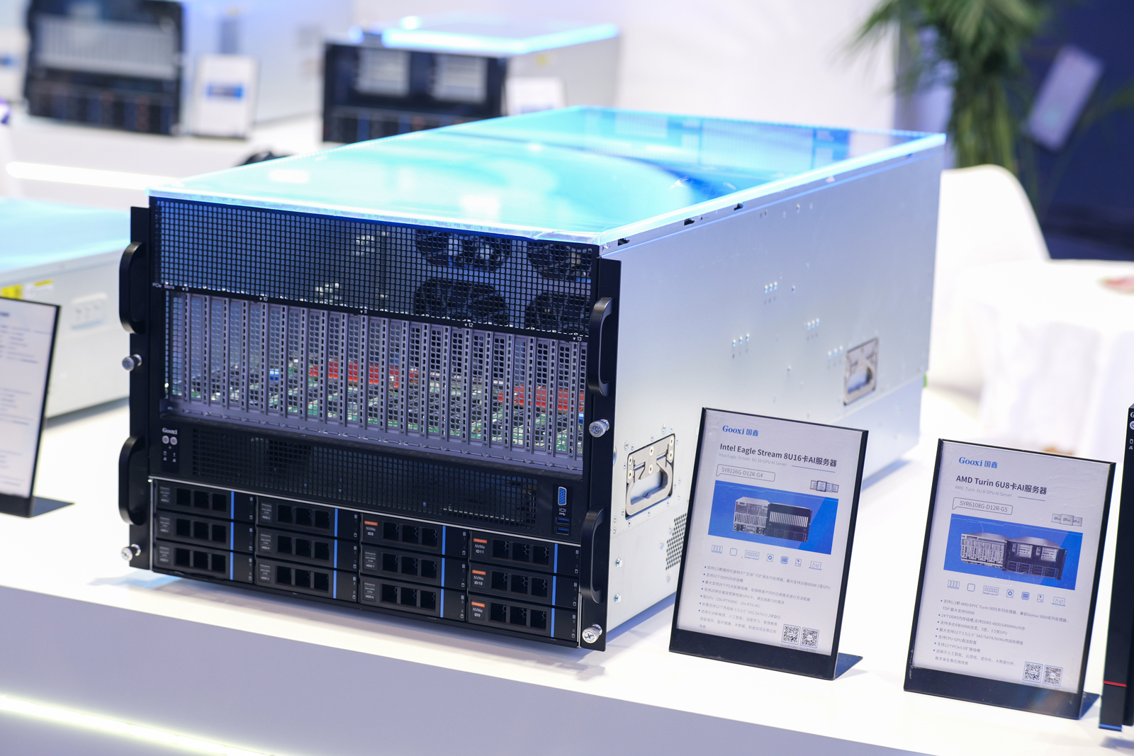 全球最高算力密度旗舰:首发亮相的Intel Eagle Stream平台8U16卡AI服务器(SY8116G-D12R-G4),以单机容纳最高20张GPU的极限设计刷新行业纪录。其配备32条DDR5内存插槽与26个PCIe扩展槽,支持12盘位热插拔存储,为千亿参数大模型构建“城市级智能中枢”提供核心承载,适用于人工智能、智慧城市、医疗健康及虚拟现实等领域。据悉,这款产品将在今年年底正式上市。