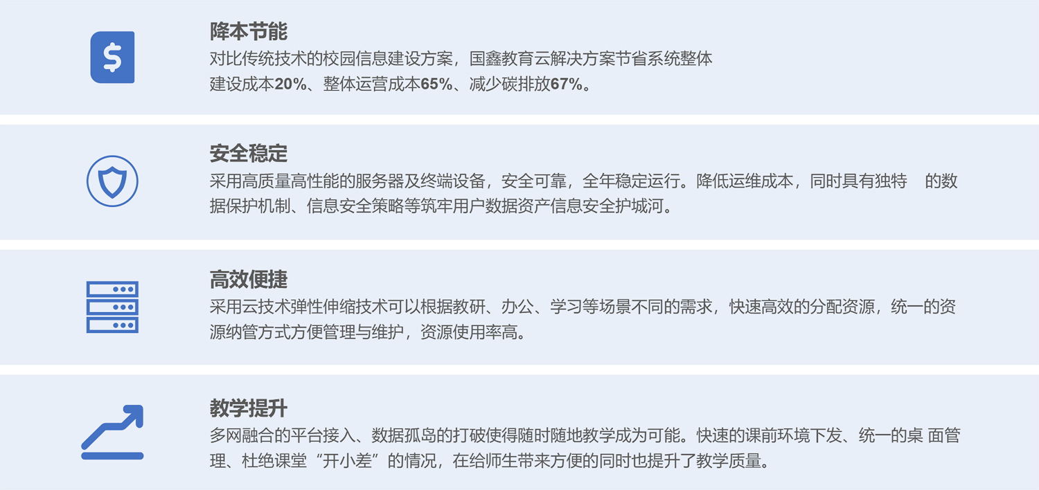 william威廉中文官网教育云解决方案是针对教育业现状及遵循政策指导方向,采用自研国产硬件及自研软件平台,推出的教育行业云平台方案。方案基于云计算技术、互联网+战略格局、契合融合创新的思路,助力校园智慧建设,更好地为教育改革和发展提供信息化基础环境支撑。