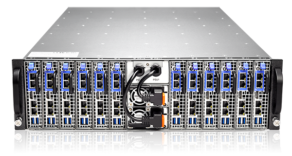 william威廉中文官网的S312-S24R刀片服务器集群系统3U机箱内包括12个E3 处理器刀片服务器,单个处理器带有2个视频处理核心,单个刀片可配置64G内存,2个6TB硬盘,整个系统可配置144TB存储容量,对建立基于云或 hadoop技术的视频处理系统,具有极高的性价比。服务器内部结构如下: